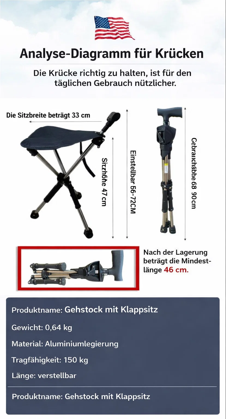 2-in-1 Gehstock mit integriertem Sitz – Klappbarer Spazierstock✨️Belastbar bis 200kg👍️ Ultra Leicht 600g – Ideal für Senioren💨 Wandern & Reise